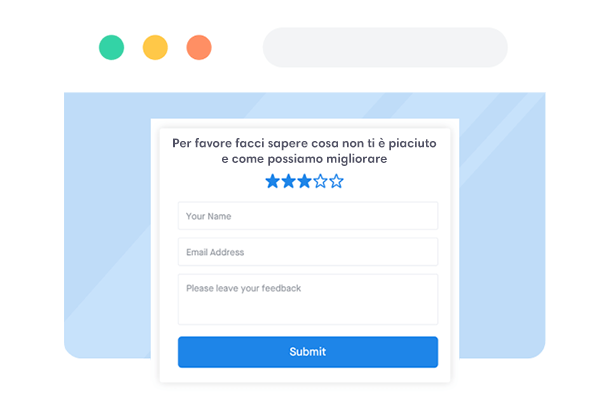 I clienti insoddisfatti hanno la possibilità di condividere i loro pensieri tramite un modulo di feedback privato che viene inviato direttamente alla tua dashboard. Comprendi perché un cliente ha avuto una brutta esperienza e affronta i suoi problemi in tempo reale, così puoi trasformarli di nuovo in acquirenti felici.