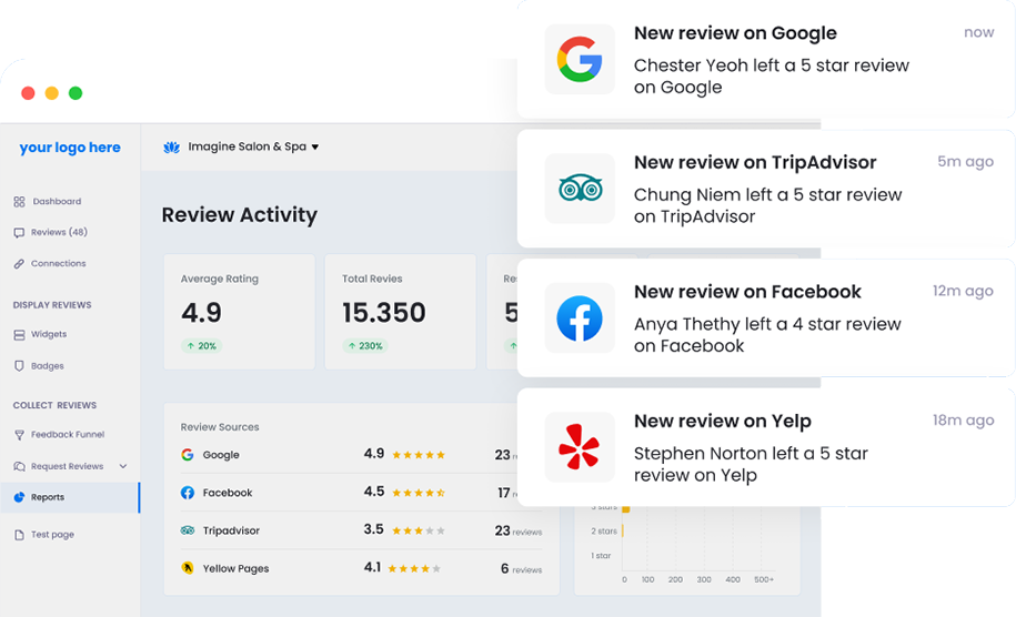 Tieni sotto controllo la reputazione online dei tuoi clienti. Ricevi notifiche e-mail all’istante quando si verificano nuove recensioni. La nostra dashboard intuitiva assicura che le agenzie siano informate e attrezzate per agire tempestivamente.