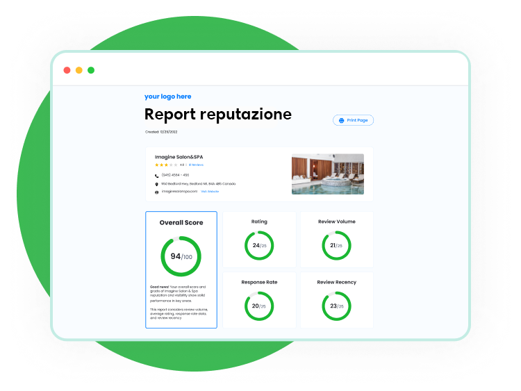 Migliora la tua strategia di marketing per la generazione di lead. Sfrutta il nostro strumento di scansione della reputazione online per creare report white-label per i clienti. Confronta i punteggi con i concorrenti per ottenere informazioni strategiche e consolidare un vantaggio online.